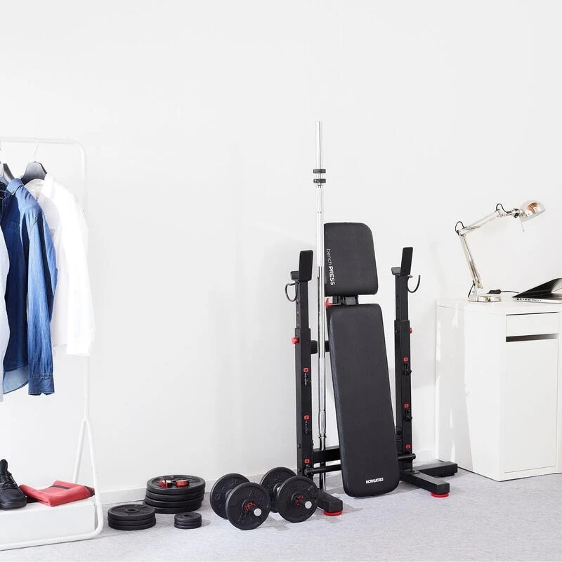 Compra en Decathlon Banco musculación con rack plegable Corength Banco de musculación plegable con soportes integrados para trabajar con barra desde rack. La altura máxima a la que se puede colocar el rack es de 120 cm.