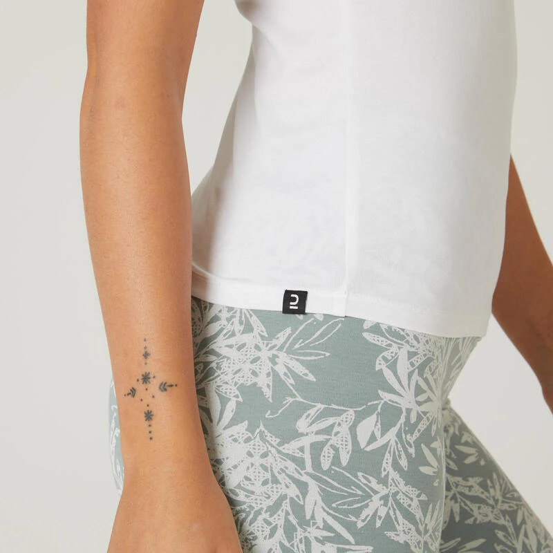 Compra en Decathlon Camiseta fitness manga corta cuello pico algodón extensible Mujer Camiseta compuesta por un 34% de poliéster lo que aporta una libertad de movimientos gracias a su tejido natural. Favorece la evacuación del sudor.