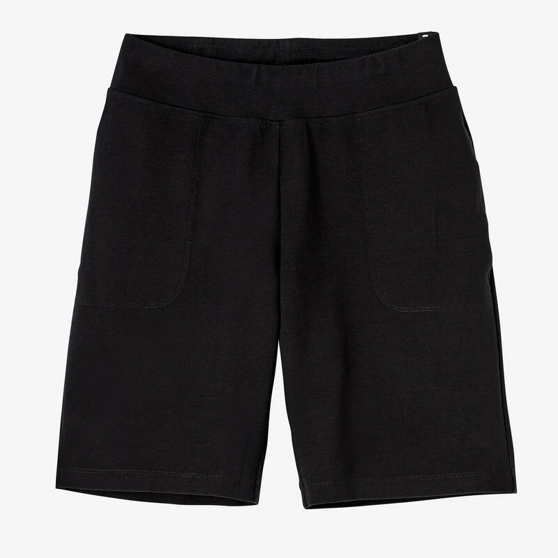 Compra en Decathlon Mallas short fitness algodón recto con bolsillo Mujer Domyos negro Short de corte recto extensible gracias al elastán en su tejido. Tiene un bolsillo delantero y aporta suavidad gracias a sus fibras de algodón.
